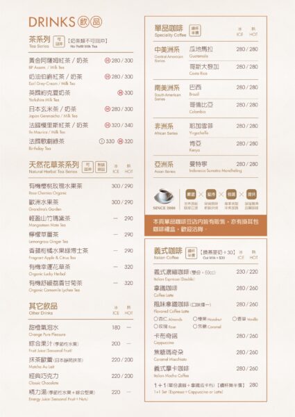 醋飲|濃湯和麵包|沙拉|熱前菜|主餐|甜點|飲品